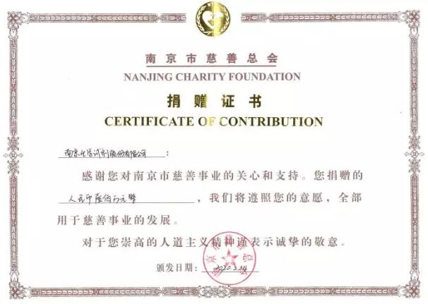 2月3日,公司通過南京市慈善總會向南京市福利院、養老機構、中小學校捐贈500ml/瓶包裝75%乙醇20000瓶,價值20萬元;2月14日,公司通過南京市慈善總會向疫情防控一線捐獻人民幣100萬元,定向用于武漢市疫情防治重點醫院和南京市新冠肺炎疫情防控工作。至此,公司向疫情防控一線累計捐獻現金和物資總價值120萬元。