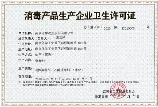 牢記使命,組織突擊生產。經報請江北新區及新材料科技園同意,1月29日,公司提前復工,突擊生產75%乙醇和過氧乙酸等應急物資。在安監、經信、衛健委等部門的大力支持下,原料和包裝材料供應難題緩解,產量由每天幾噸迅速提升到十幾噸、幾十噸。同時,衛生部門還服務上門、簡化流程,加急批準了“消毒用品生產企業衛生許可證”。